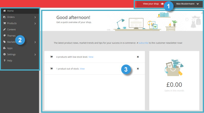 Help centre Get started General Introduction to your online shop With your online shop, selling is very easy. After you have set up the shop, your customers can place their orders. The administration area You are managing your shop in the administration area. There you can edit the content of your shop, add products, manage orders and much more. 1 Select View your shop and your shop will open in a new browser window. This will allow you to immediately check any changes you have made. 2 What would you like to do next? You can use the main menu to switch between individual pages of the administration area. 3 The working area occupies the most space within the administration area. This is where the majority of the work for your shop is carried out. Depending on which page you have called up, you might find forms or charts that you can use to manage your shop. In the administration area, you may occasionally see this information symbol: . Hover your cursor over this symbol at any point to view a short help text about the associated field. First steps These are the first steps you should take care of before promoting your shop: Manage the basic settings Select a design theme Edit the shop’s content Create categories for products Add products Add delivery methods Add payment methods Test your shop You also have these options: Select apps from the App Store Offer your products on product portals Edit orders Was this article helpful?