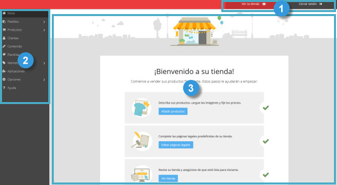 Centro de ayuda ¡Cómo empezar! General Introducción a tu tienda online Vender desde tu tienda online es muy fácil. Después de haber configurado tu tienda, tus clientes podrán comenzar a realizar sus pedidos. El área de administración Para gestionar tu tienda debes utilizar el área de administración. En ella podrás editar el contenido de tu tienda, añadir productos, gestionar los pedidos y mucho más. 1 En la parte superior derecha encontrarás varias funciones importantes. Si quieres ver tu tienda, haz clic en Ver su tienda, que se abrirá en una nueva pestaña de tu navegador. De esta manera, podrás revisar todos los cambios que realices en el área de administración 2 El menú te permite desplazarte por las diferentes áreas de tu área de administración. El área de trabajo ocupa la mayoría del espacio en el área de administración de tu tienda. 3 La zona de trabajo es la que ocupa más espacio dentro de la zona de administración. Aquí es donde se realiza la mayor parte del trabajo de tu tienda. Dependiendo de la página a la que hayas accedido, encontrarás formularios o tablas que podrás utilizar para gestionar tu tienda. En el àrea de administración encontrarás a menudo el símbolo de información . Si sitúas el cursor sobre el mismo, encontrarás pequeños textos de ayuda sobre la pestaña o campo en el que te encuentras. Primeros pasos Estos son los primeros pasos que tienes que dar antes de promocionar tu tienda: Ajustes generales Uso de plantillas de diseño Editar el contenido de tu tienda Gestionar las categorías Añadir productos Añadir métodos de envío Añadir métodos de pago Prueba de la tienda / comprobación de funcionamiento final También puedes utilizar algunas de estas opciones: Tienda de Aplicaciones y Plantillas Productportalen en marktplaatsen Gestionar los pedidos ¿Fue útil este artículo?